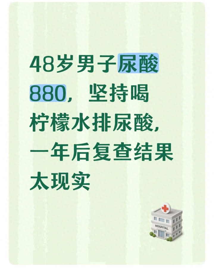 今天我给天下讲一个发生在我身边、卓绝真实又有警默示旨的高尿酸案例。一位48岁的男性一又友,前年体查验出尿酸径直冲到880μmol/L,远超正常圭臬,纰谬照旧开动不惬意,医师明确条目他坐窝降尿酸,否则痛风、伤肾跑不掉。他传奇喝柠檬水能碱化尿液、匡助排尿酸,还毋庸吃药伤身段,于是一口药没吃,每天坚合手喝柠檬水,整整坚合手了一整年。最近他去病院复查,收尾出来既现实,又给系数尿酸高的东谈主提了个醒。