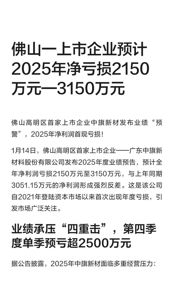 > 米兰 佛山一上市企业2025年亏损2150万—3150万元