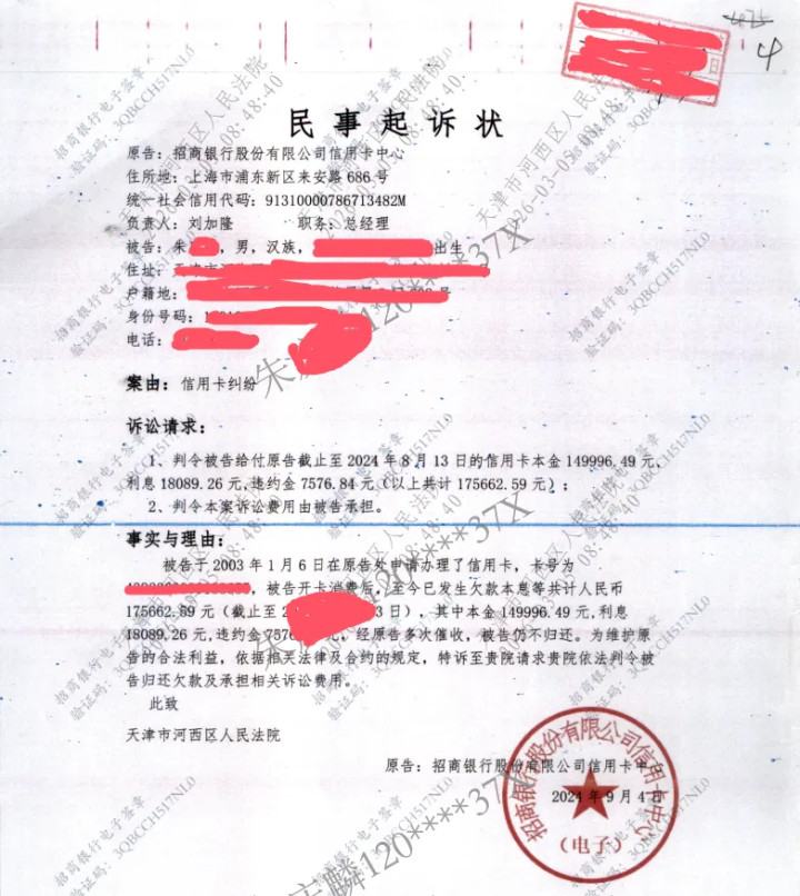 2025年8月4日,天津市河西区东说念主民法院判决朱先生偿还招商银行的信用卡欠款本金149996.49元以及利息、违约金,驳回招商银行信用卡中心其他诉讼请求。