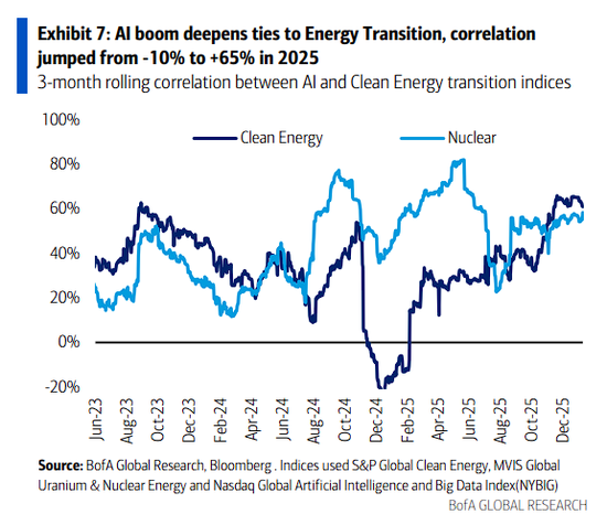 然而,研报称,市场正在迅速意识到这种联系。清洁能源与AI的相关性在一年内从-10%飙升至65%。