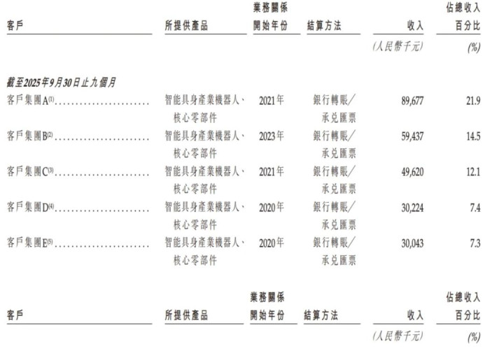 客户拓展方面,玖物智能已构建多元客户群体,截至往绩记录期末,累计向156名来自16个工业领域的客户售出超过11000台智能具身产业机器人,主要客户留存率达72.7%。从细分领域地位来看,据弗若斯特沙利文资料,2024年玖物智能在智能具身产业机器人解决方案收入中排名中国第二,市场份额5.9%,其中在清洁能源技术领域排名第一,先发优势明显。