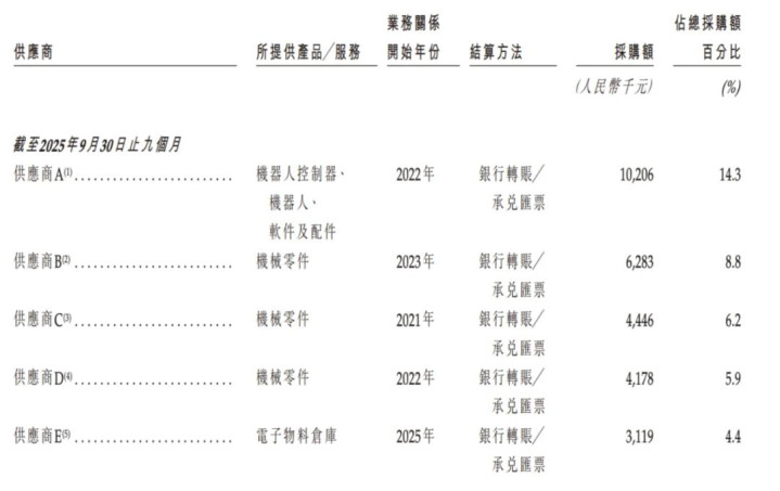 供应链稳定性问题同样亟待解决。2023年、2024年及2025年前三季度,玖物智能向前五大供应商采购额占比分别为40.9%、32.9%及39.6%,最大单一供应商采购占比分别为14.5%、12.3%及14.3%,供应商集中度相对较高。若主要供应商出现产能不足、供应中断或提价等情况,将直接影响玖物智能生产连续性及产品质量稳定性,进而影响交付能力和客户合作关系。