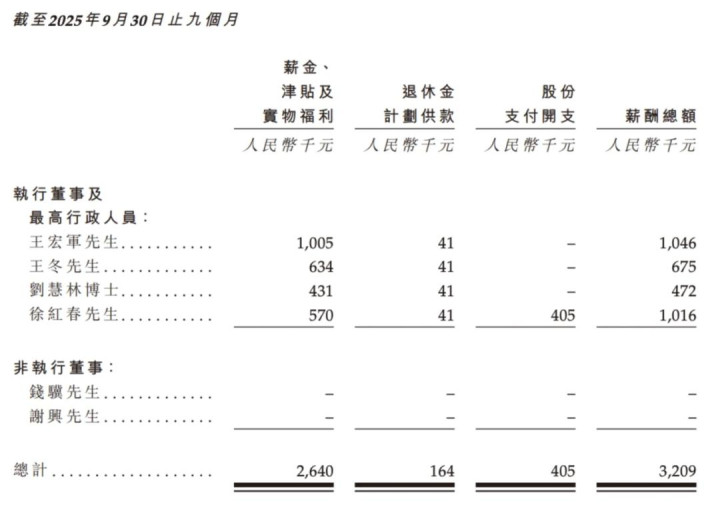 正因如此,玖物智能才具备了参照智能制造行业头部企业标准制定的底气,结合岗位价值、绩效贡献构建了“基础薪酬+绩效奖金+年终奖金”的三维结构,与经营业绩深度绑定。2025年前三季度,以王宏军、王冬、刘慧林、徐红春为代表的最高行政人员总薪资320.9万元,较2024年同期增长14.65%。