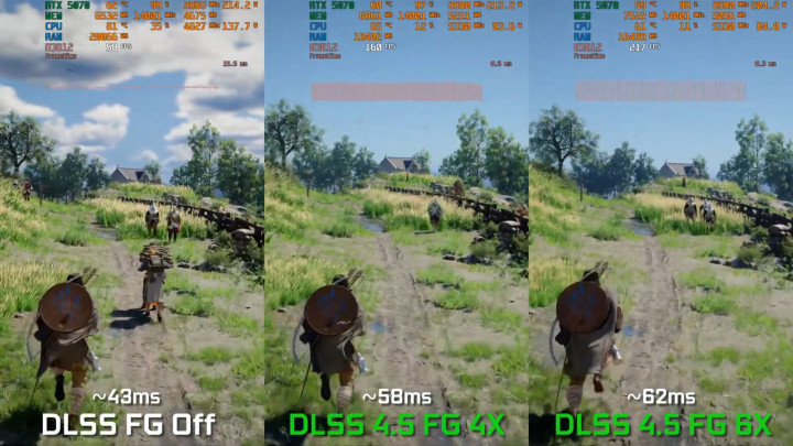 接下来测试的是《红色沙漠》,DLSS关闭样貌下,《红色沙漠》在2K最高画质、开启色泽重建的配置下,平均帧率仅为58帧,最低帧率50帧傍边,画面卡顿昭彰,尤其是在稠密的绽开寰宇中快速出动、切换场景时,帧率波动较大,以致会出现倏得的掉帧表象,况兼画面中会出现幽微的噪点,影响视觉体验,这是因为色泽重建绑定DLSS,关闭DLSS后,色泽重建也无法开启,只可保留基础色泽跟踪,画面质感也会有所着落。开启DLSS 4X帧生成后,帧率倏得陶冶至160帧,最低帧率150帧以上,画面卡顿表象完全消失,色泽重立功能也能肤浅开启,画面质感大幅陶冶,帕卫尔大陆的草原、山脉、建筑细节皆能了了呈现,辽远的光影后果也愈加传神,操作手感也变得愈加畅达,无论是探索绽开寰宇,照旧与敌东说念主热烈战斗,皆能保捏踏实的帧率。