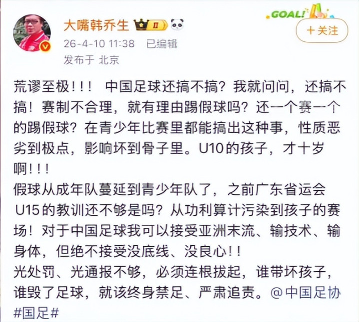 4月10日,韩乔生在直播中直指U10假球案的乖谬,口吻千里重又好听,中国足球不错输技巧、输身体,但毫不经受没底线、没良心,这句话戳中精深球迷的心声。
