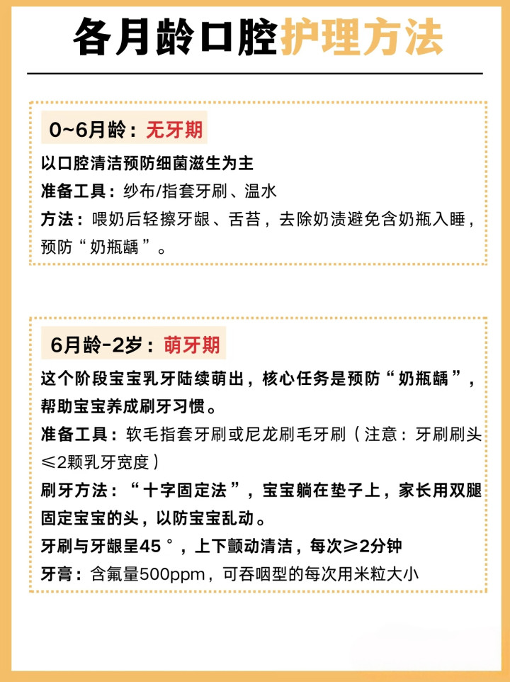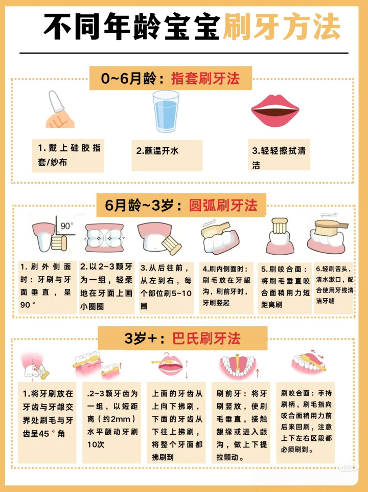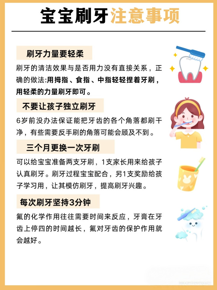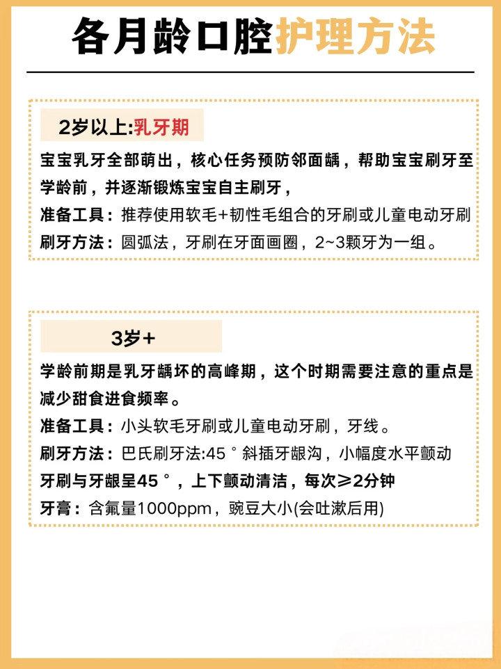 这个阶段宝宝乳齿基本长皆,不错尝试让孩子我方刷,但家长一定要补刷,因为孩子紧密动作还没发育好,刷不干净。