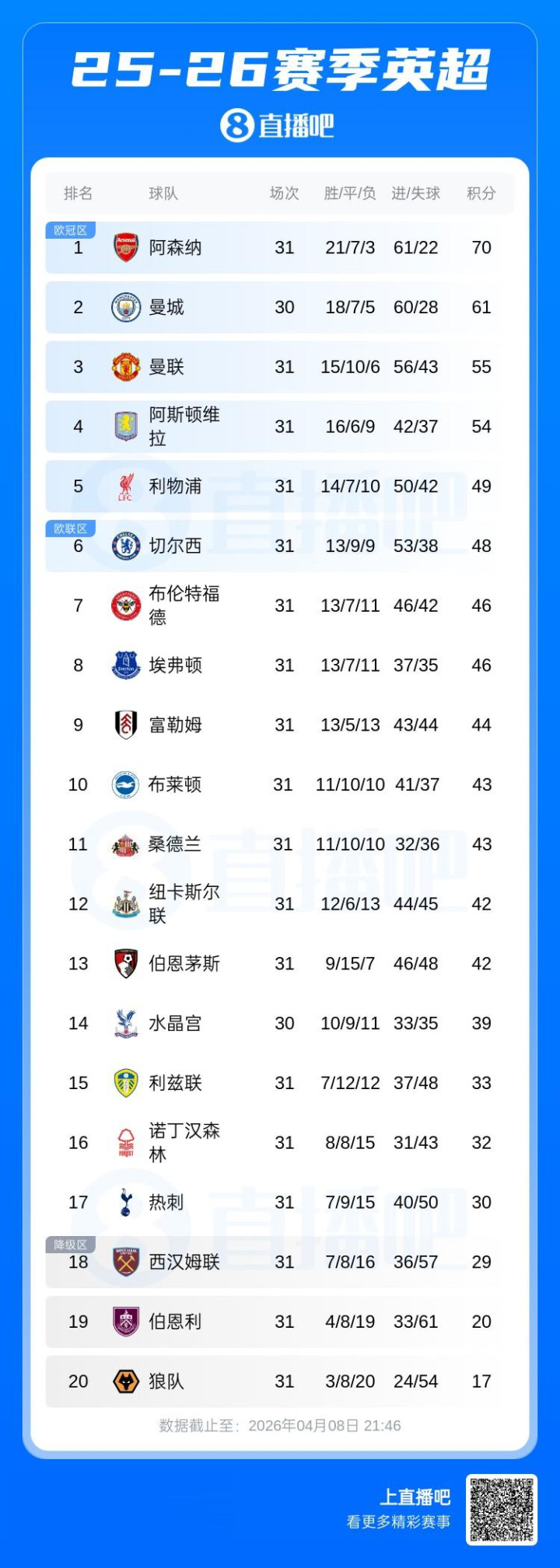 直播吧04月08日讯欧冠1/4决赛首回合,阿森纳1-0投降葡萄牙体育,英超联赛本赛季欧战积分达到25.013分,锁定了1个独特欧冠正赛限额,下赛季至少将有5支球队晋级欧冠正赛,同期最多有7支球队得到履历。