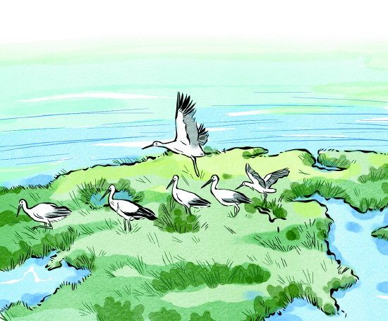4月的黄河三角洲,湿地返青,百鸟翔集。在黄河入海口的一派生态建立区内,成群候鸟闲逸觅食,处处飘溢着春风答允。