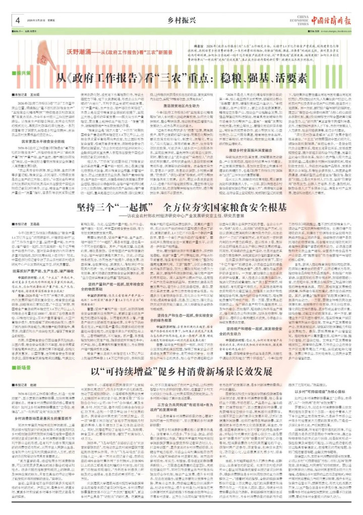 编者按2026年《政府职责文牍》为“三农”职责锚定主义。从稳守1.4万亿斤食粮产量底线,到构建常态化帮扶机制,再到扶植乡村消费新场景,一系列部署丝丝入扣,勾画出“稳粮、强基、活成分”的施政干线。靠近复杂多变的表里部环境,何如加力践诺新一轮千亿斤食粮产能进步当作,让“中国饭碗”装得更满、端得更稳?何如让乡村消费新场景从“一时打扰”走向“长效发展”,真确成为拉动内需的新引擎?敬请祥和本期乡村振兴。