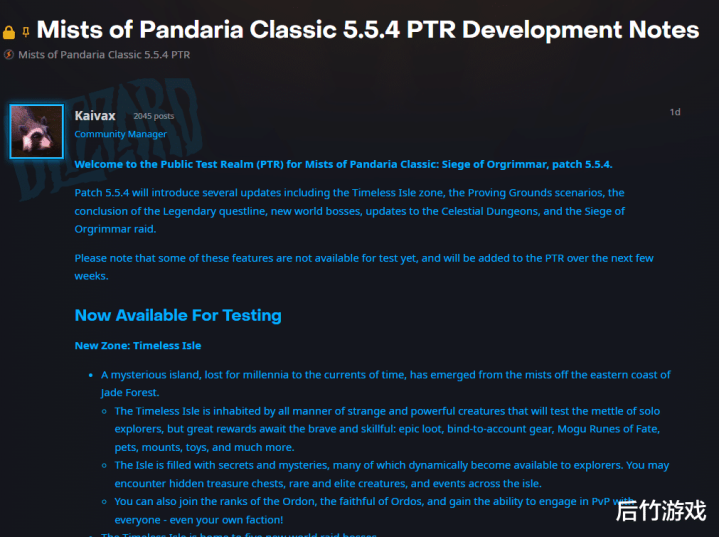 暴雪在《魔兽寰宇》熊猫东说念主怀旧海外服的PTR上发布了5.5.4版块,也便是P5更新,开启不灭岛和传奇任务线的终章,决战奥格瑞玛团本的测试将于4月24日启动,天界地下城、挑战时势和试真金不怕火场的测试将在稍后进行。