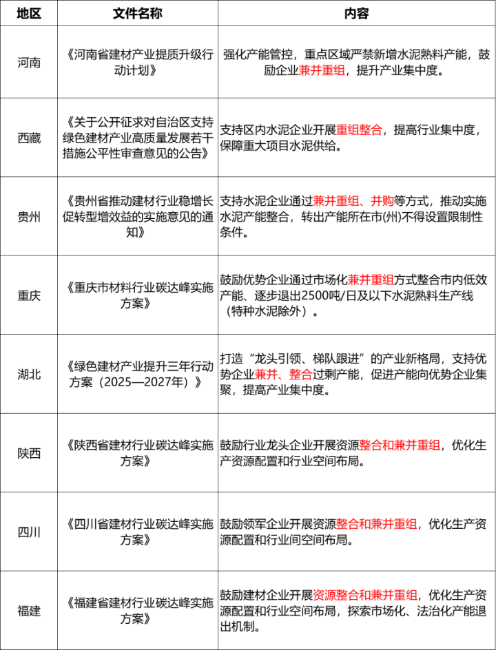 据了解,近年来,多地出台文件积极倡导并支持区域内水泥行业采取资源整合与兼并重组的策略整合行业内资源。