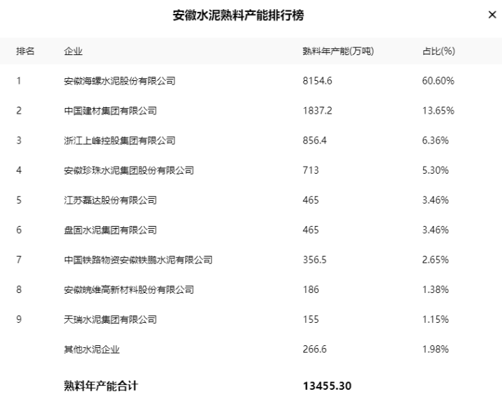 根据中国水泥网数据,安徽省熟料产能总计13455.3万吨,位居全国首位。在安徽省内,海螺水泥占据主导地位,其熟料产能占比高达60%;中国建材占比为13.65%。