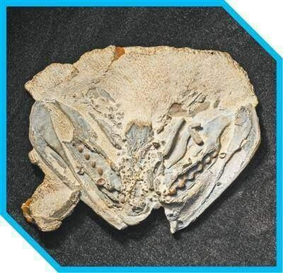 钝齿宏颌鱼化石,发现于云南曲靖志留纪晚期(约4.23亿年前)地层中,全长1米过剩,是其时最大的鱼类。从无缺的头颅化石中不错看到,嘴里交错长着小帽状的“齿垫”,上头密布小牙。